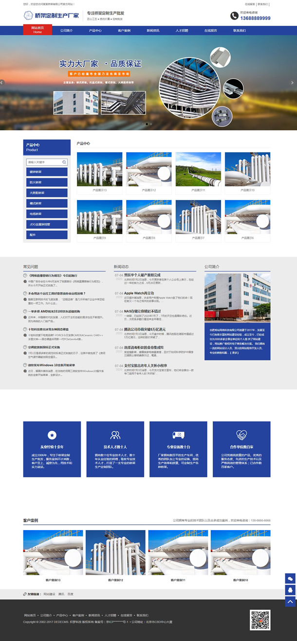桥架定制企业型网站pbootcms模板,一套蓝色企业风格的网站模板,PC+WAP带数据,可实现织梦电脑端网站和手机端网站数据同步,适用于设备生产厂家、通用企业,当然这套模板也可以修改成其他行业网站使用。