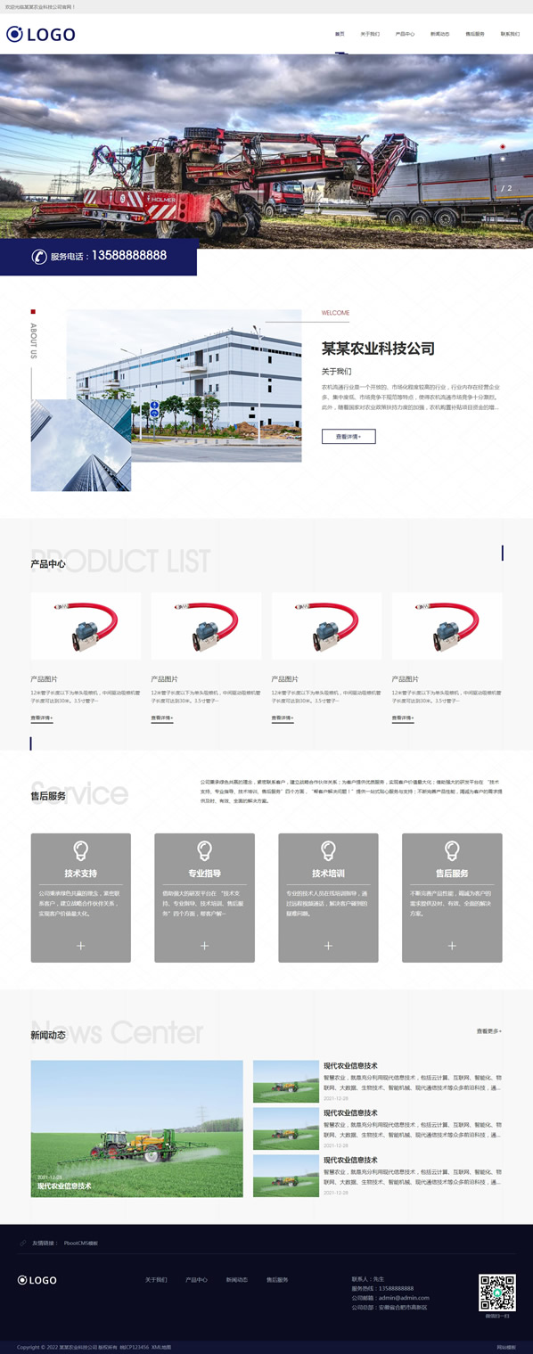 PbootCms农业机械设备类网站自适应模板,pbootcms内核开发的一套企业网站模板,安装后和演示站一样,模板简洁大气,自适应结构。兼容电脑、平板、手机等移