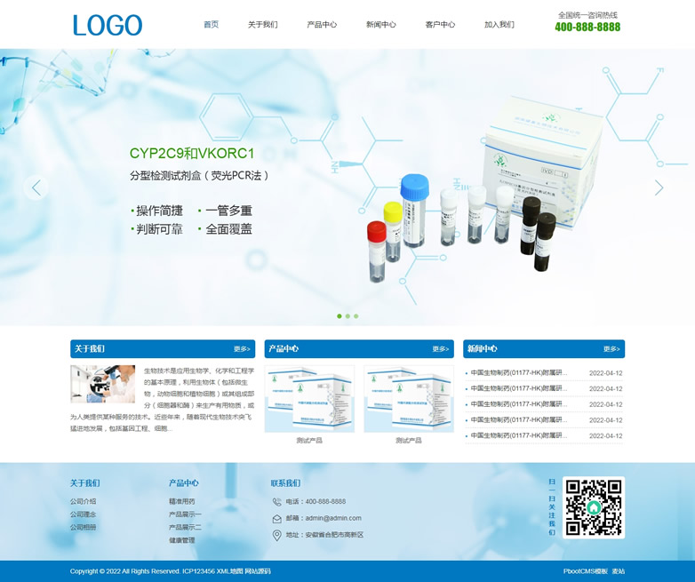 生物科技医疗公司类pbootcms网站模板(PC+WAP),PC+WAP结构网站模板,pbootcms内核开发的一套企业网站模板,安装后和演示站一样,模板简洁大