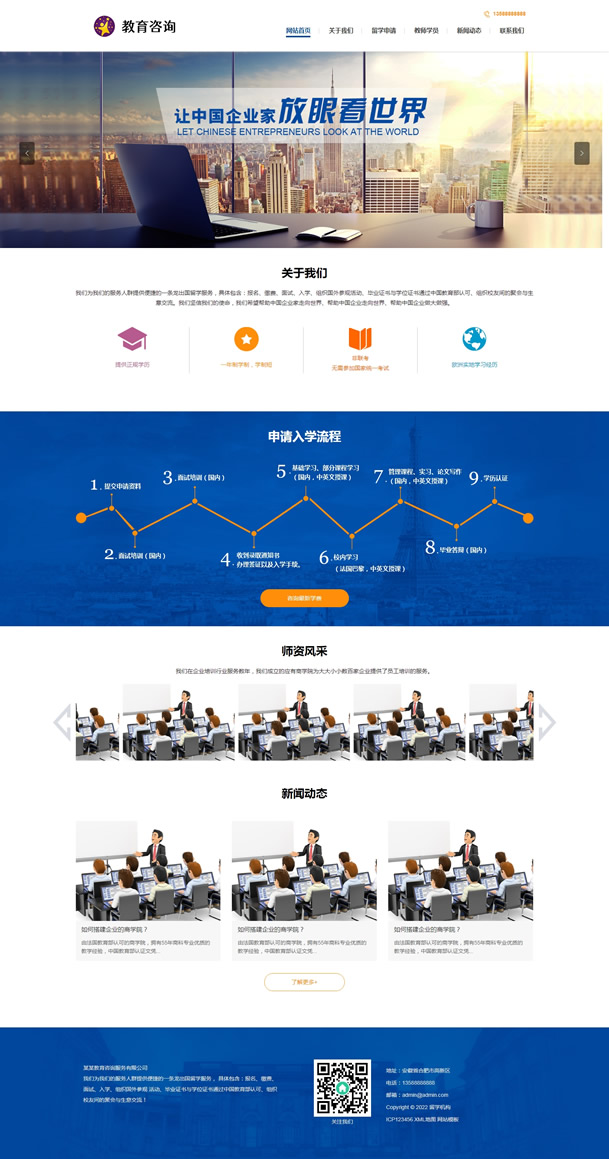 教育咨询服务类网站pbootcms模板(PC+WAP),PC+WAP结构网站模板,pbootcms内核开发的一套企业网站模板,安装后和演示站一样,模板简洁大气,pbootcms内核PC+WAP结构。兼容电脑、平板、手机等移动设备。