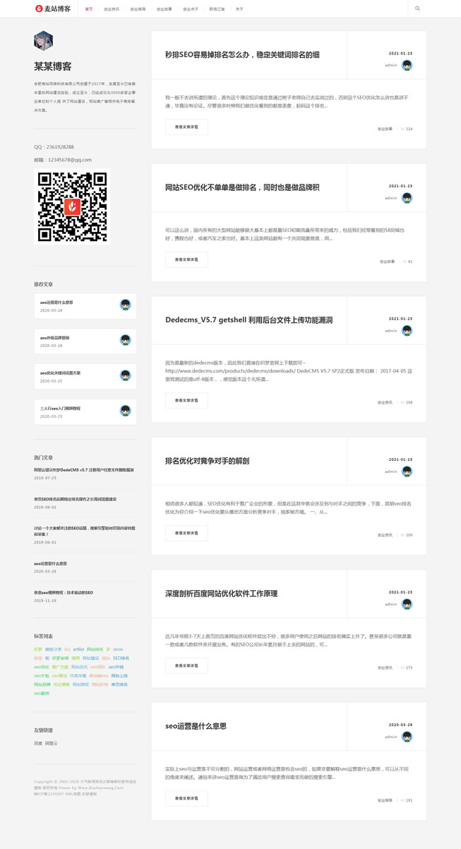 大气个人博客日记资讯类织梦模板,自适应结构,大屏宽屏结构,版面整洁利于用户体验。TAG静态化处理,页面整洁大气,利于SEO和收录。